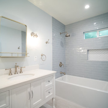 Alcove shower - mid-sized farmhouse gray tile, white tile and subway tile alcove shower idea in San Francisco with shaker cabinets, white cabinets, an undermount sink, marble countertops, a one-piece toilet, white walls and a hinged shower door